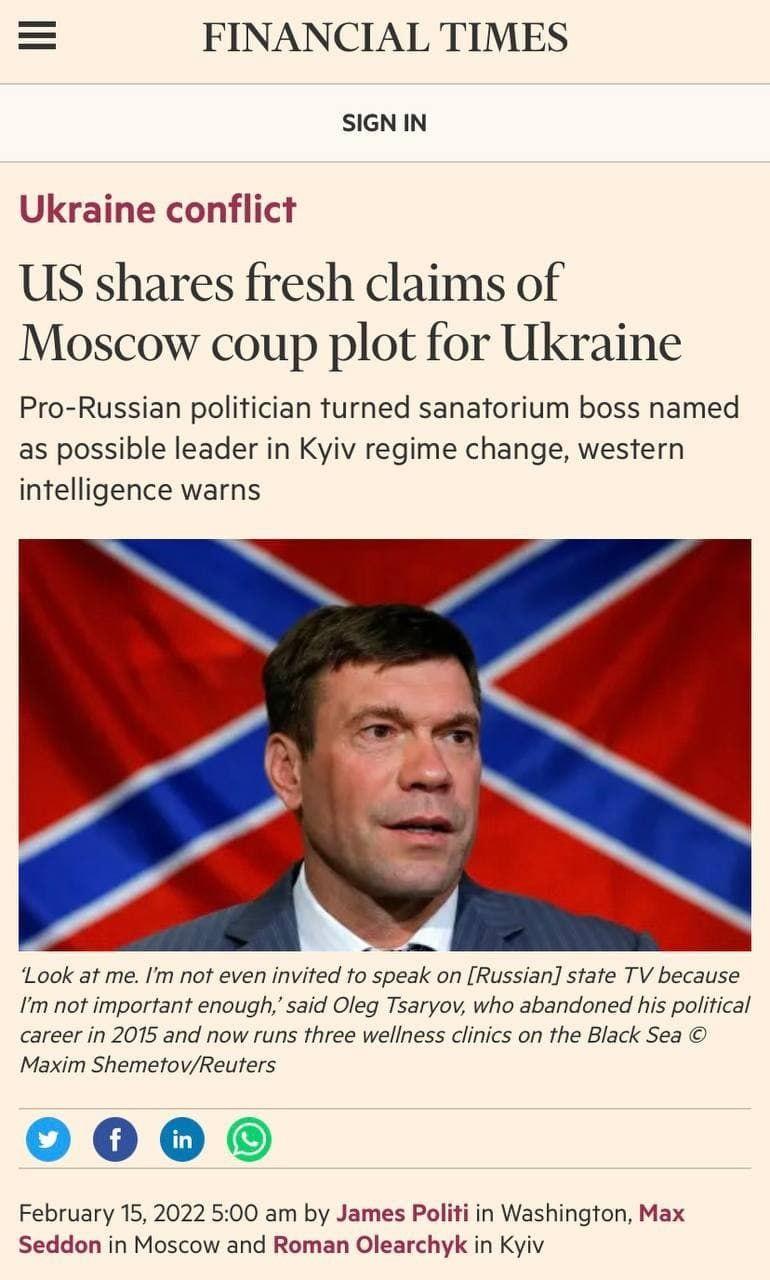 The British edition "Financial Times", referring to an unnamed representative of Western intelligence, reported that the Kremlin is considering Oleg Tsarev as a potential leader of the puppet government of Ukraine in the event of a successful invasion.