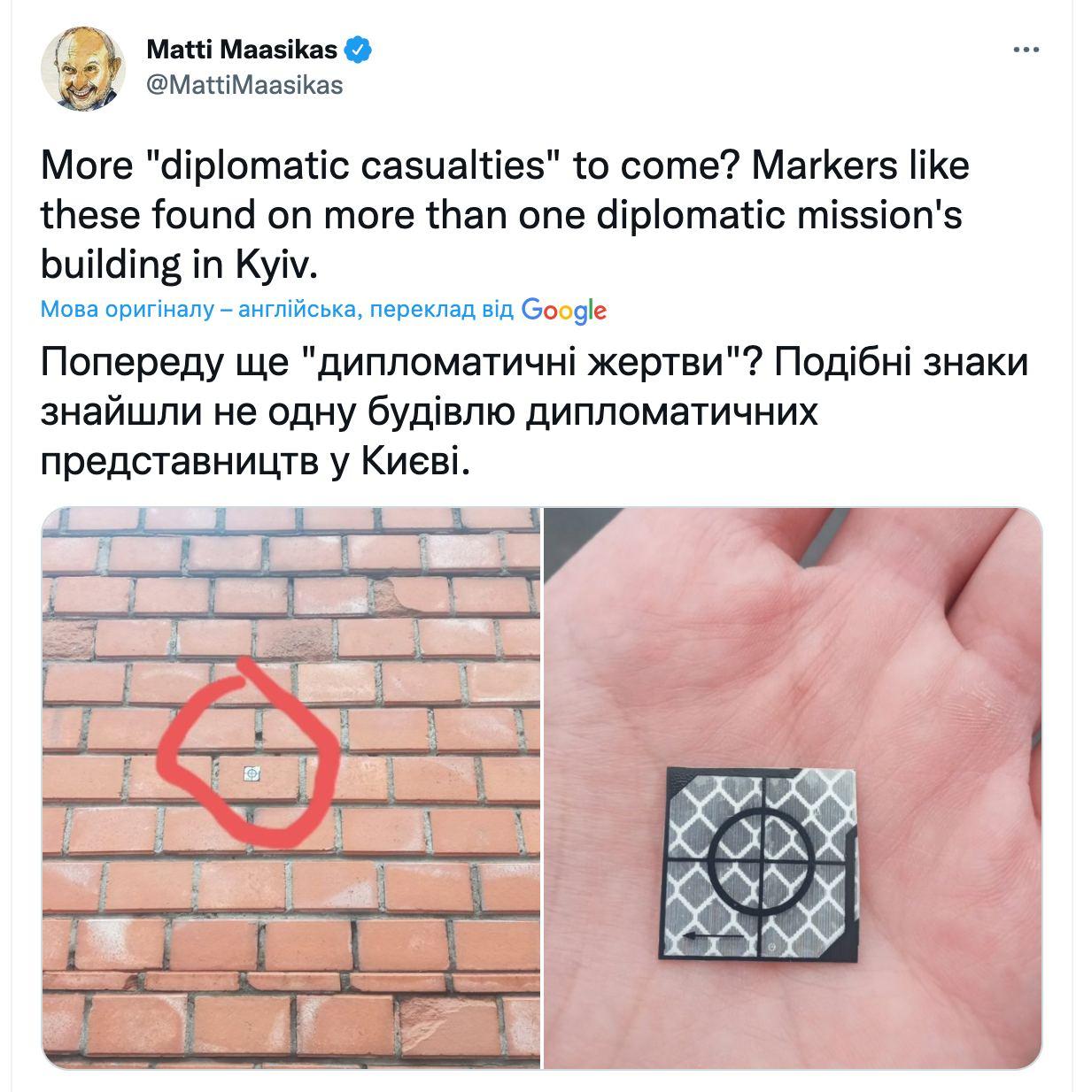 On the buildings of diplomatic missions in Kyiv, markings similar to conditional signs for adjusting the fire of Russian occupiers were found.