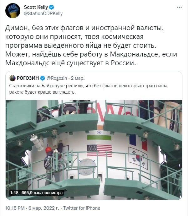 And this is a blow to the eggs. Direct hit! Former NASA astronaut Scott Kelly wrote to Rogozin in Russian. ))