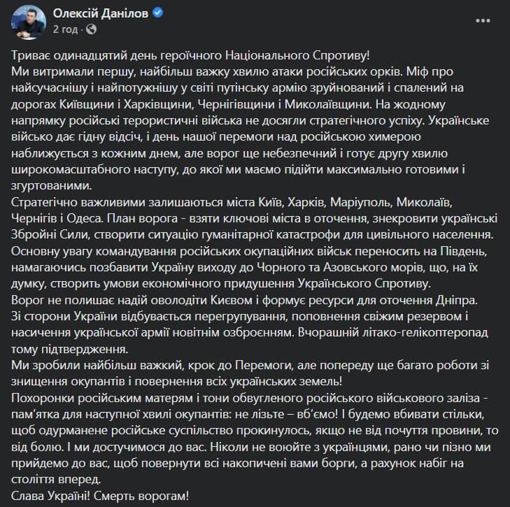 The enemy continues its offensive operation against Ukraine, concentrating its main efforts on surrounding the cities of Kyiv, Kharkiv, Chernihiv, Sumy, and Mykolaiv, reaching the administrative borders in Luhansk and Donetsk regions, and creating a land corridor from the Autonomous Republic of Crimea towards Mariupol - Novoazovsk.