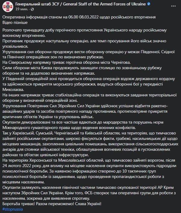 "The world does not believe in the future of Russia. It does not talk about it. They talk about us, help us, and are preparing to support our reconstruction after the war. Because everyone has seen: for a people who defend themselves heroically, this 'post-war' will definitely come. Address of the President of Ukraine Volodymyr Zelensky in the evening of the thirteenth day of the war."