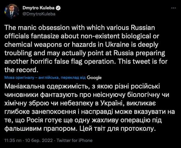 💬 Kuleba noted that Russia may be preparing another horrifying operation under false flag, which is indicated by its fantasies about the development of chemical weapons in Ukraine.