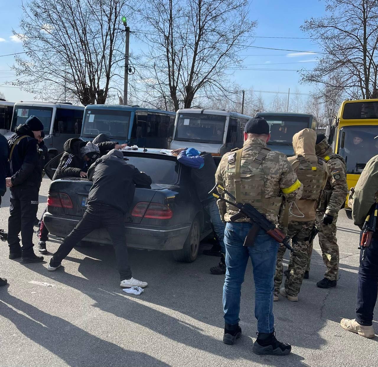 ⚡️ Today during the evacuation of residents from Bucha, Irpin, Vorsela, and Borodyanka in Bilotserkivtsi, a group of suspects was detained for looting in a Mercedes car..