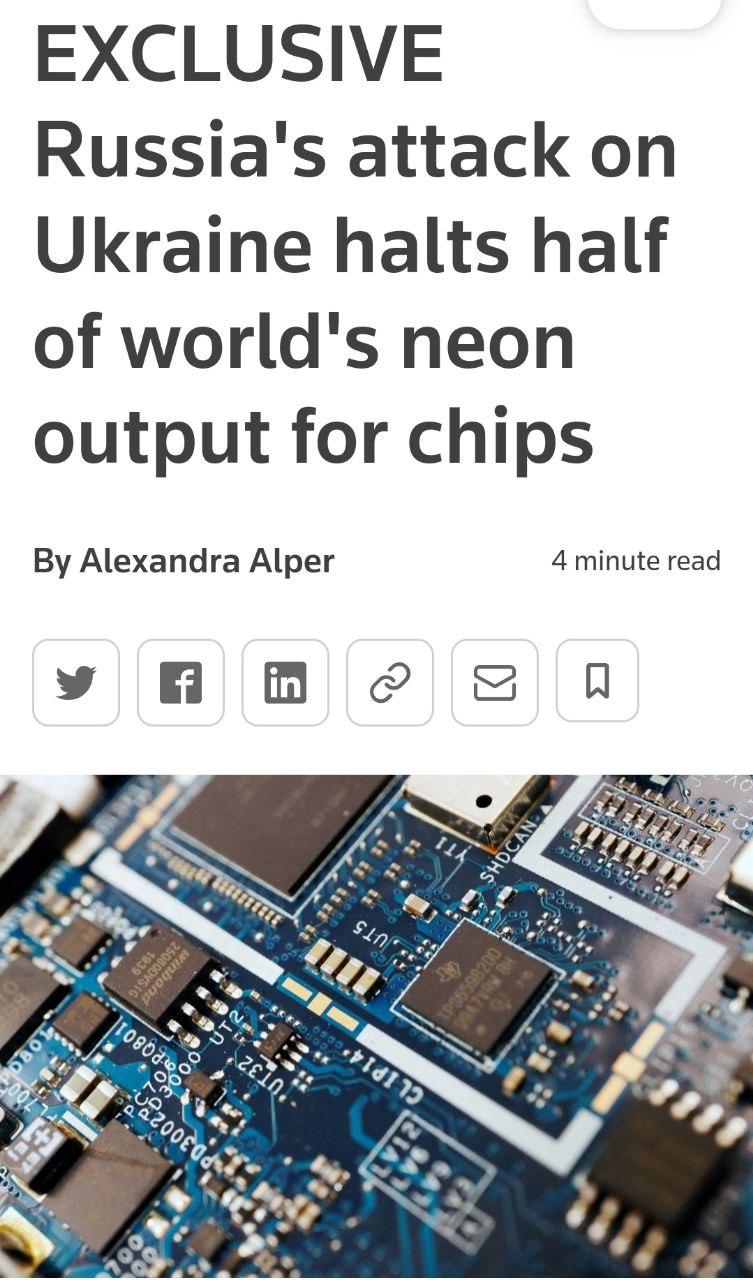 Reuters: Russia's invasion of Ukraine halted half of the world's neon production for chips.
