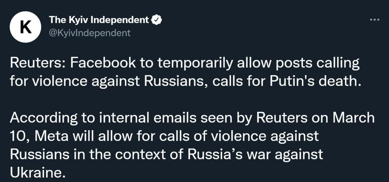 New policy of Facebook and Instagram that allows expressing "anger" towards Russian armed forces will be applied only in Ukraine. Facebook and Instagram will not take measures against posts with phrases like Death to Russian invaders. Checking now. ))