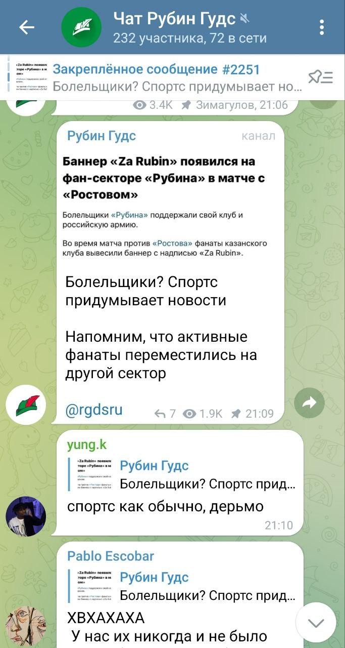 Active fans of the football club "Rubin" from Kazan changed their usual sector to another one in order to stay away from the "Za Rubin" banner. This is already being discussed in the team's fan chat. "Rubin" played against "Rostov", and the club's management decided to curry favor with the Kremlin. The fans did not appreciate this.