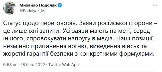 Member of the Ukrainian delegation in negotiations with the Russian Federation, Advisor to the Head of the Presidential Office, Mikhail Podoliak replied that the positions of the Ukrainian side remain unchanged.