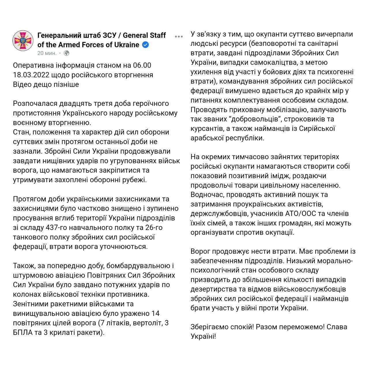 🔴Operational summary of the General Staff as of 00:00 on March 18th. Main: