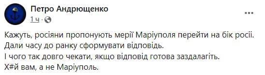 🇺🇦The mayor's advisor in Mariupol suggested giving a response to the occupiers' ultimatum regarding the surrender of the city without waiting for morning.