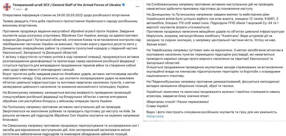 ‼️ Operational summary of the General Staff of the Armed Forces of Ukraine as of 24:00 on March 20, 2022 regarding the Russian invasion.
