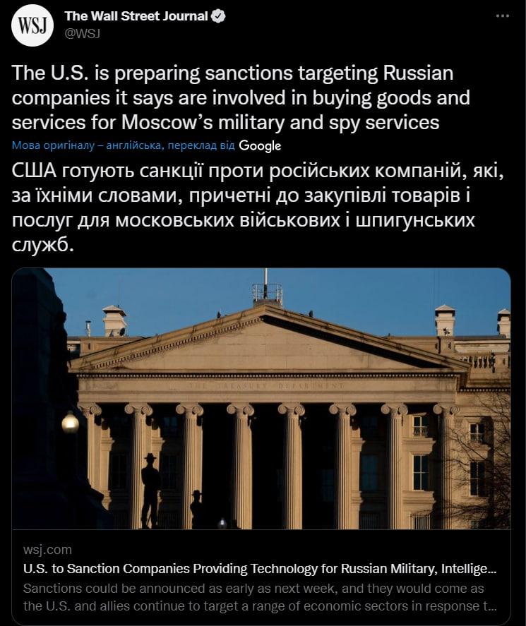⛔️The United States intends to impose sanctions against Russian companies that provide services and goods to intelligence services and the Russian military, reports The Wall Street Journal.