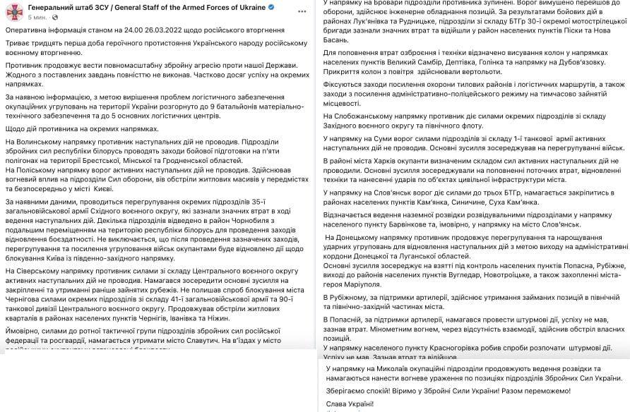 ❗️Operational information of the General Staff of the Armed Forces of Ukraine as of 24.00 26.03.2022 regarding the Russian invasion.