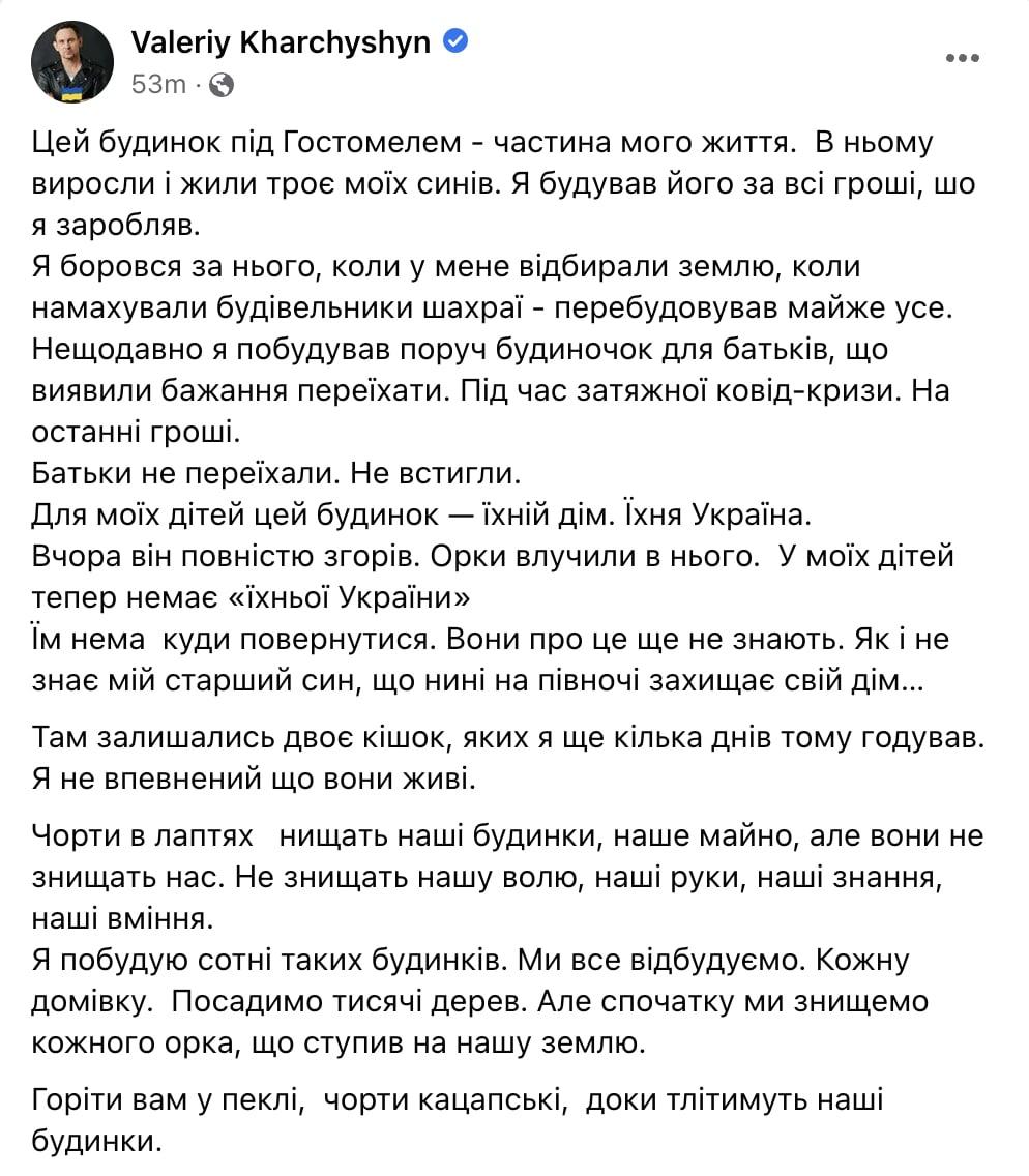 🗣Leader of the band Druga rika Valeriy Kharchyshy told that Russian occupants destroyed his house near Hostomel
