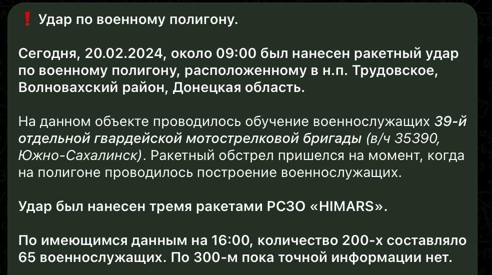 Training was conducted for servicemen of the 39th separate guards motorized rifle brigade (military unit 35390, Sakhalin). The strike occurred at the moment when the formation was being held on the training ground.