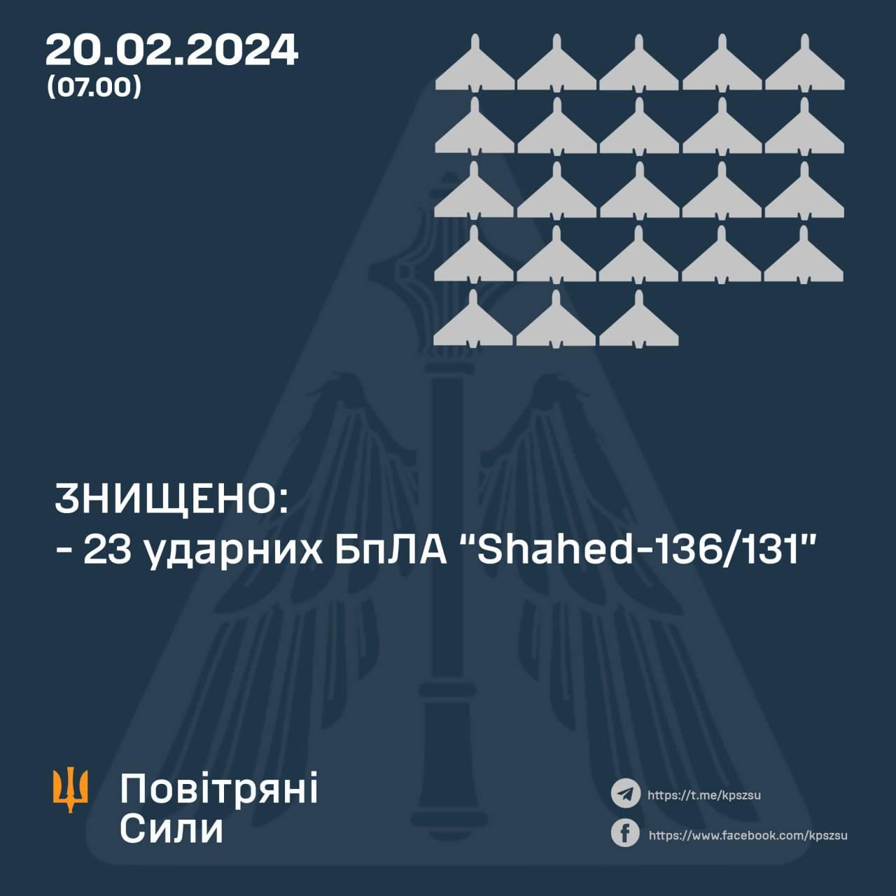 ❌ On the night of February 20, 2024, the enemy attacked with two guided missiles S-300/S-400 (Belgorod region), guided aviation missile Kh-31 (Zaporizhia region), and 23 unmanned combat aerial vehicles Shahed (Primorsko-Akhtarsk - RF).