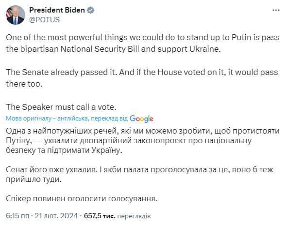 The President of the United States also appealed to the Speaker of the House of Representatives Johnson to put the bill on assistance to Ukraine to a vote.