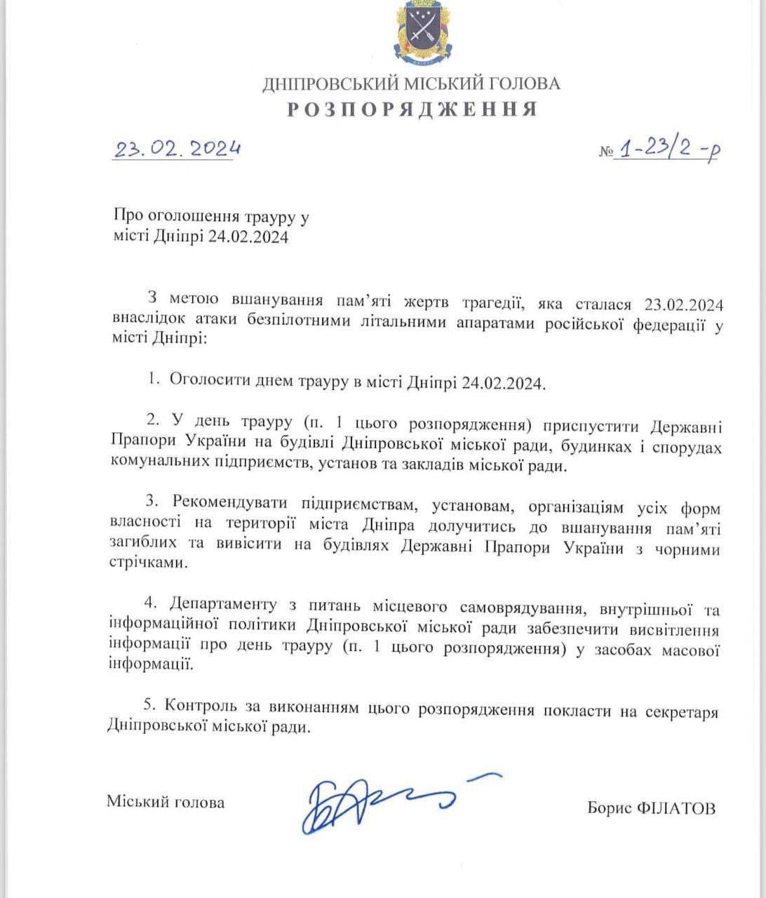 On Saturday, February 24, in Dnipro, a day of mourning will be announced for those killed as a result of a UAV strike on the city, - city mayor Boris Filatov.