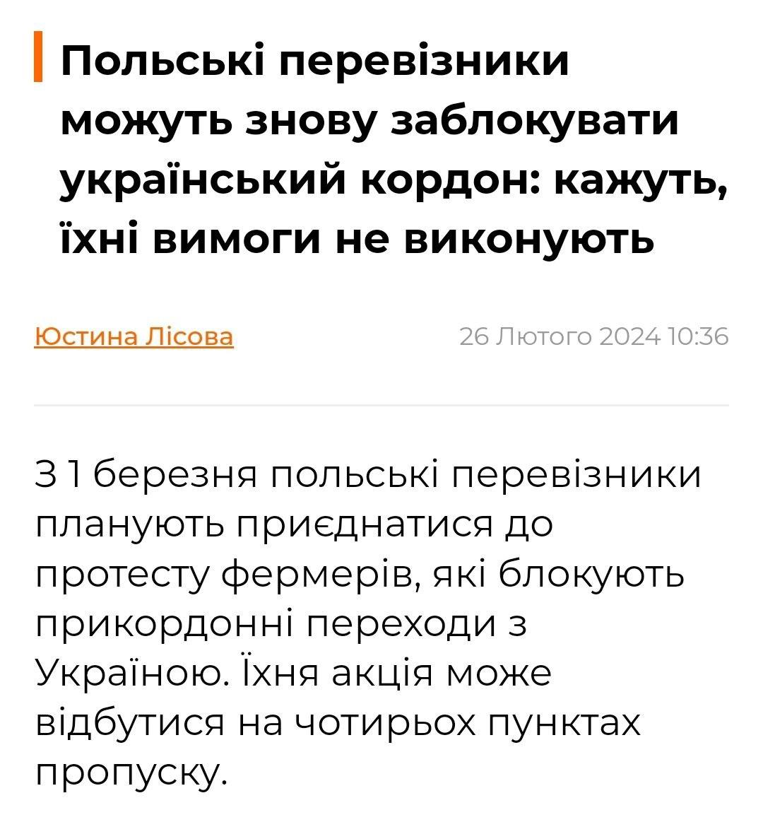 - The situation on the Polish border is only getting worse. Starting from March 1st, Polish carriers plan to join the farmers' protest. What will happen next? What will be the actions of the Polish government? And what can our politicians achieve?
