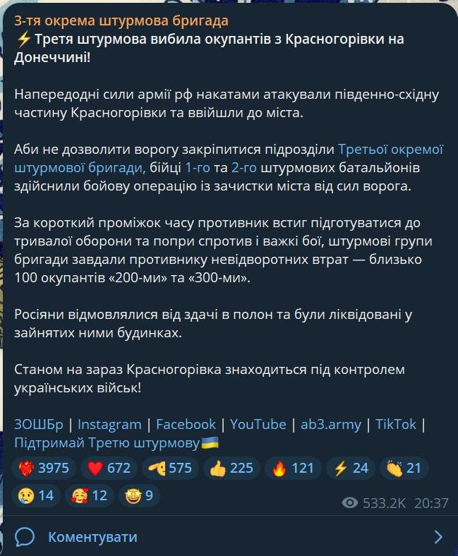 💪🏻The third assault brigade returned Krasnogorivka in Donetsk region under the control of Ukrainian military.
