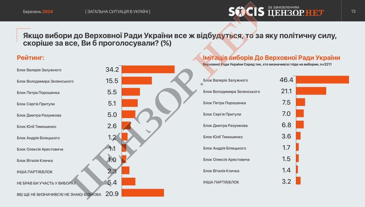 For the political force of Valeriy Zaluzhny, they would give their vote 34.2% (46.4% among those who decided and will go to the elections). For the political force of Volodymyr Zelenskyy - 15.5% (21.1%). For Petro Poroshenko - 5.5% (7.5%). For Serhiy Prytula - 5.1% (7.0%). And for Dmytro Razumkov - 5% (6.8%).