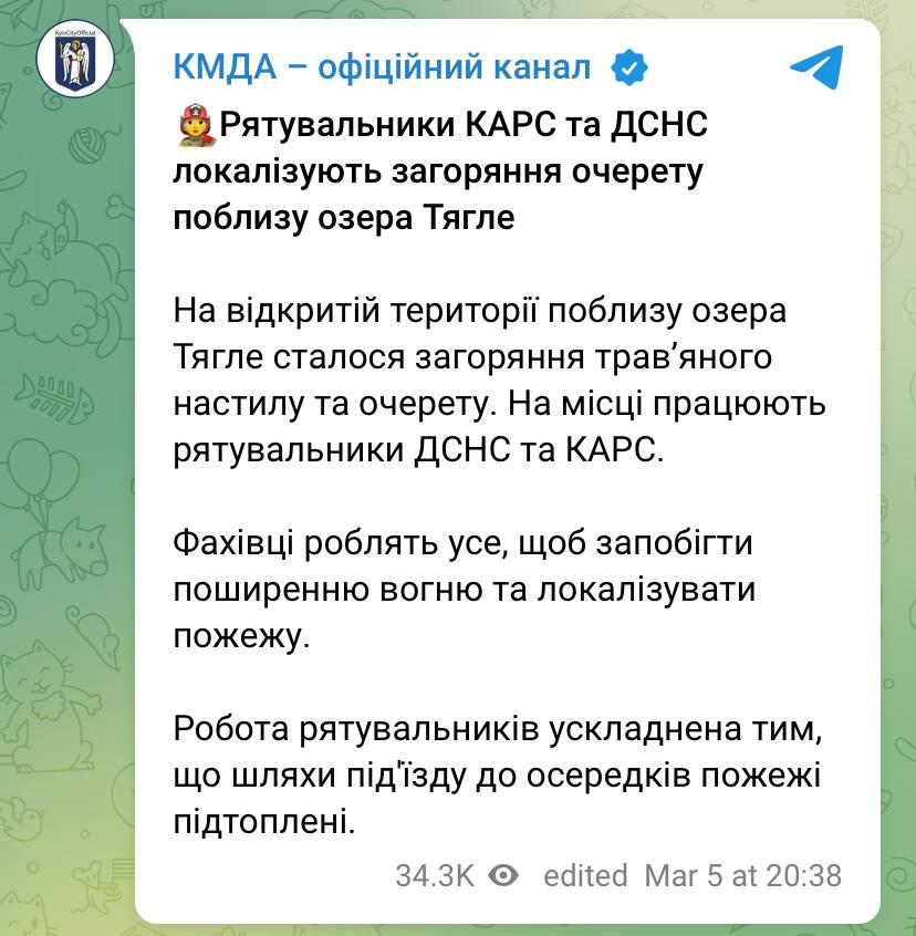 ❗️Yesterday evening near Tyahele Lake in Osokorky in Kyiv dry grass and reeds caught fire, - Kyiv City State Administration.