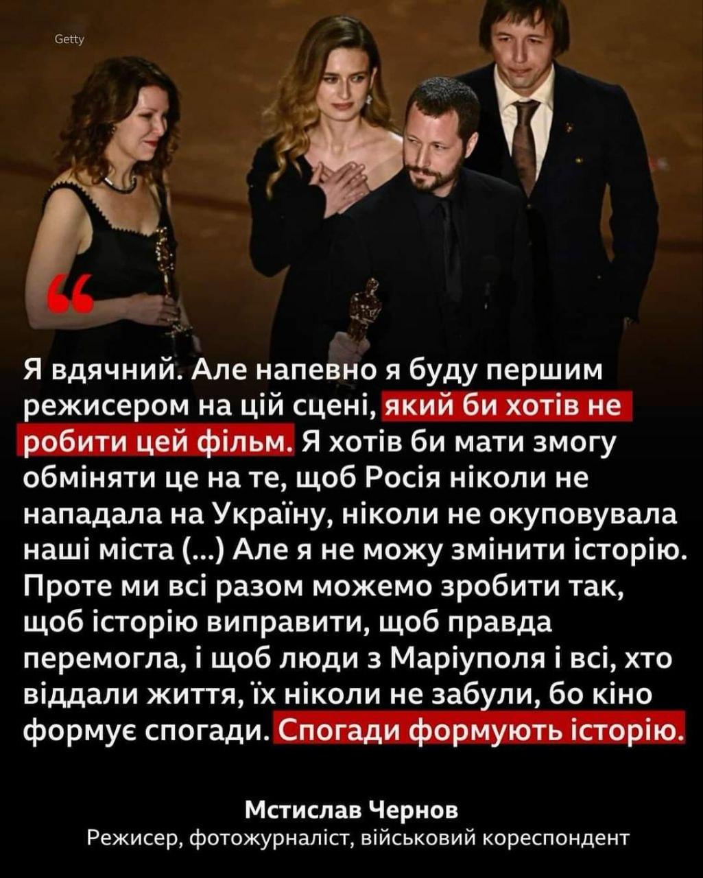 Probably, I will be the first director to say this here: I wish this film had never been made. I wish Russia had never invaded Ukraine, never occupied our cities. I would give this award for Russia not to kill tens of thousands of my fellow countrymen-Ukrainians, to release all Ukrainian military and civilians who are captive, - film director Mstyslav Chernov.