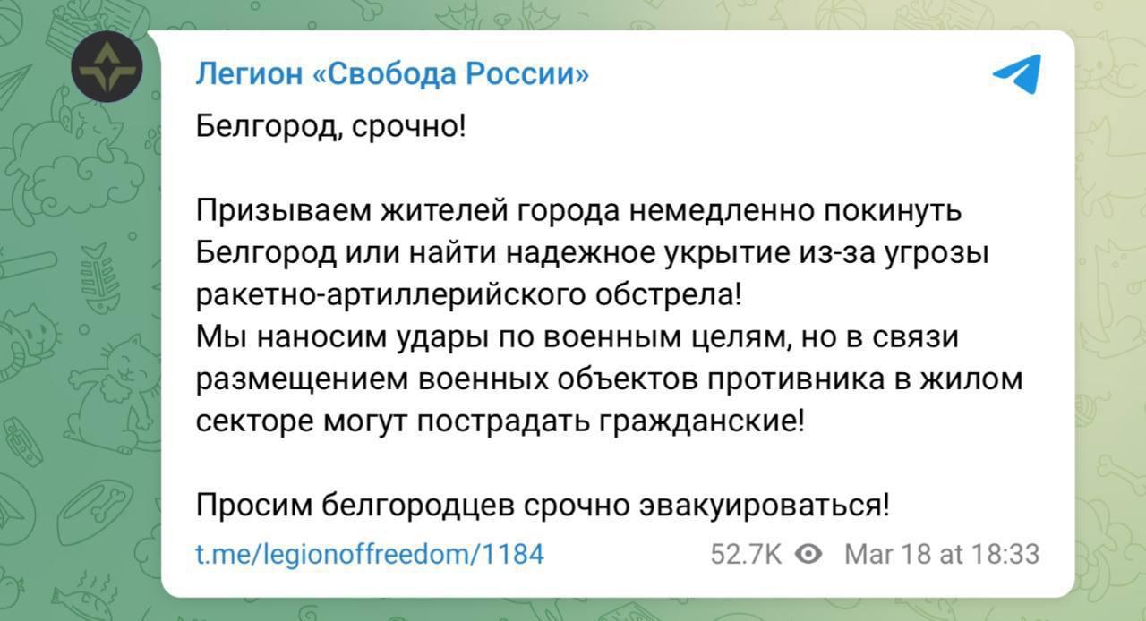 ❗️ The Legion of Freedom of Russia calls on residents of Belgorod to immediately leave the city or find reliable shelter