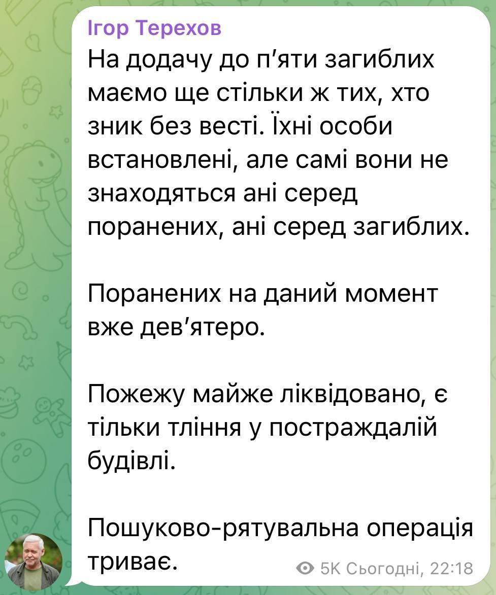 Relatives of the deceased and injured Kharkiv residents received such messages and calls after the Russian attack on Kharkiv today during the day.At the moment in Kharkiv there are 5 dead, 9 wounded and 5 missing.the mayor Terikhov reported.