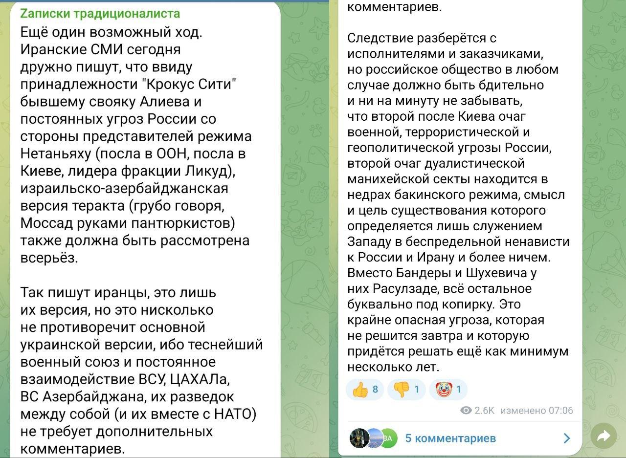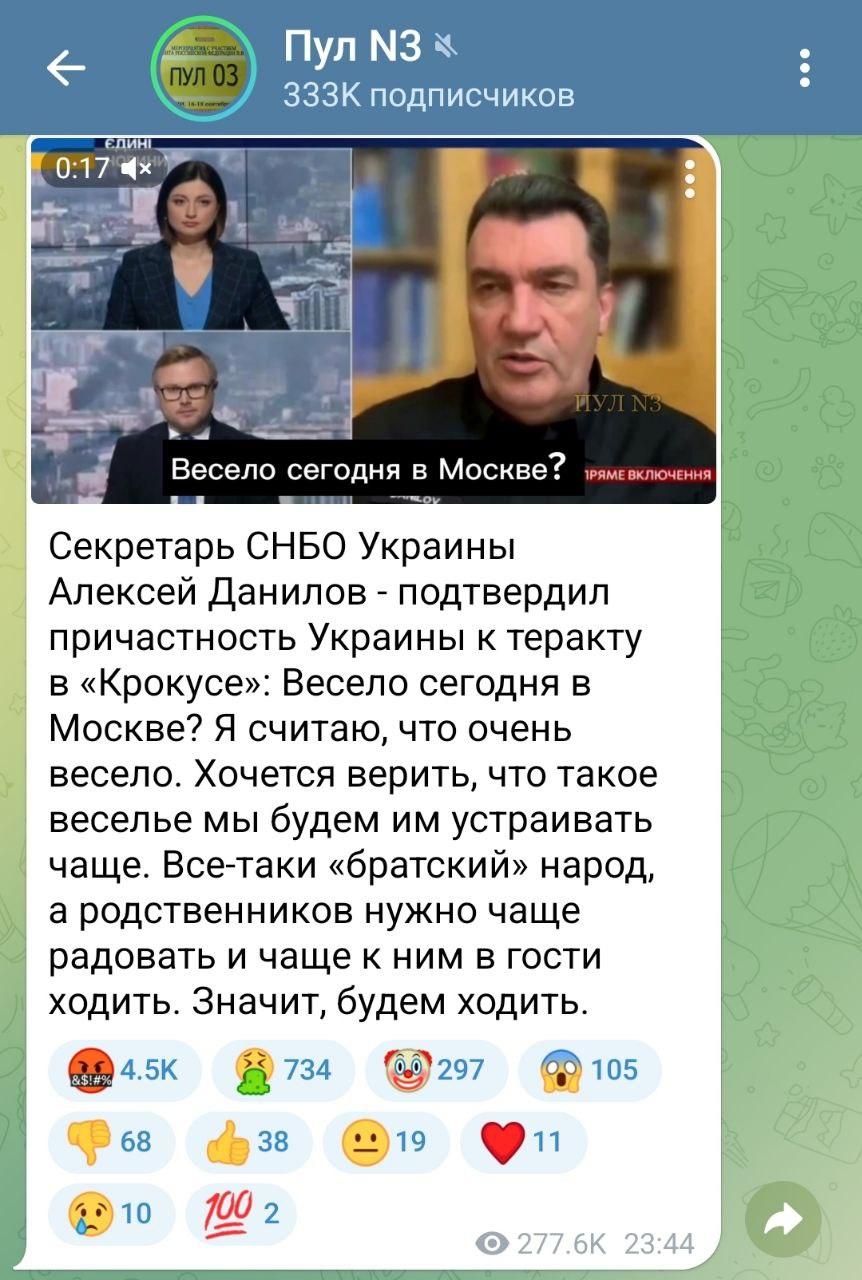 In the Russian nothing has changed. Kremlin propaganda, warming up Russia's information space, threw in a deepfake where the Secretary of the National Security and Defense Council Danilov takes responsibility for organizing a terrorist act at "Krokus". Done, primitive and stupid, but the Russians have been fed worse.