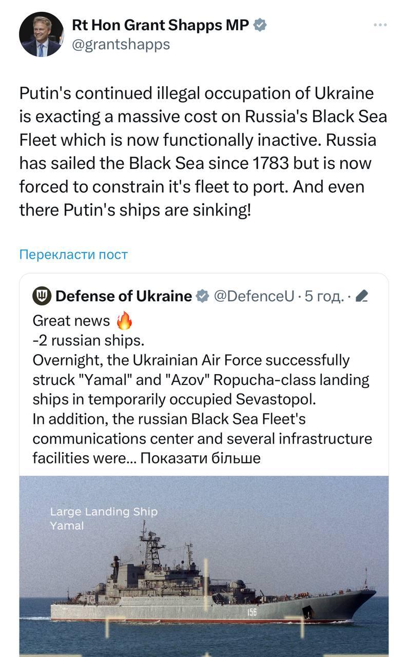 Illegal occupation of Ukrainian territories by Putin causes huge losses to the Black Sea Fleet of Russia, which is currently non-operational. Russia has been sailing the Black Sea since 1783, but now is forced to limit its fleet to the port. And even there Putin's ships are sinking!, - wrote Shapps on the social network X.