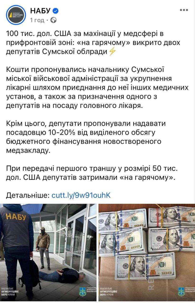 On March 26, in Sumy, law enforcement officers detained two deputies who tried to bribe the head of the Sumy city military administration for $100,000.
