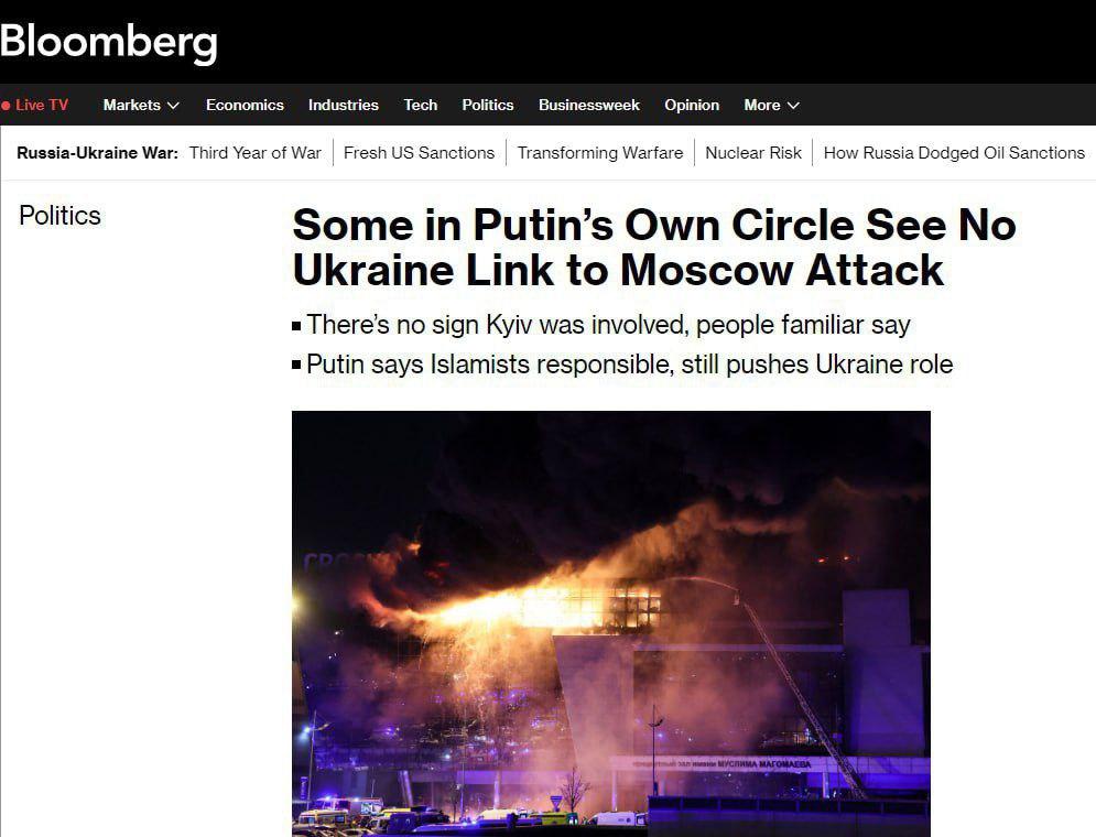 🤡 Bloomberg's report that those close to Putin do not believe in Ukraine's involvement in the terrorist attack in Crocus, Russian Foreign Ministry's representative Zakharova called the mother of all fakes