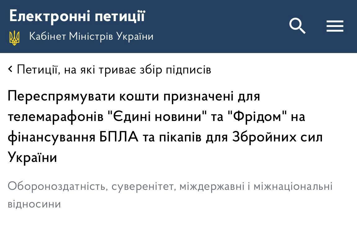 ❗️❗️❗️A petition has appeared on the Cabinet's website to redirect funds from the telethon to the Armed Forces.