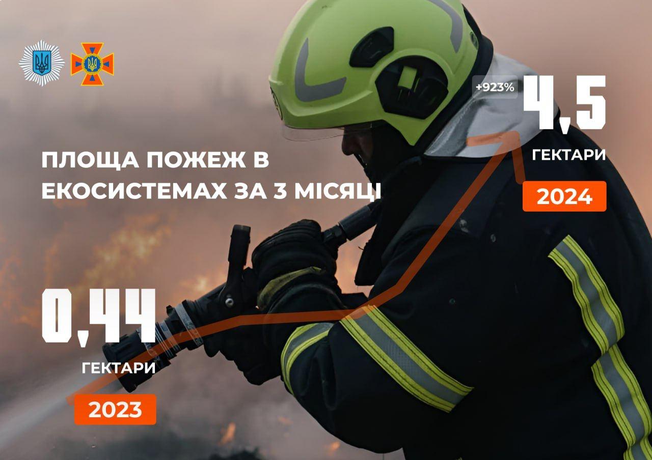 In Kyiv, the square of fires in ecosystemsgrownby 923% compared to last year. In the first three months of 2024, fires covered 4.5 hectares of land, compared to 0.44 hectares last year. Rescuers almost daily go out to extinguish fires. The Ministry of Internal Affairs urges not to burn dry grass.
