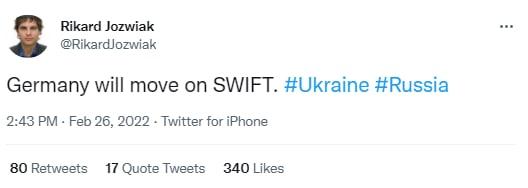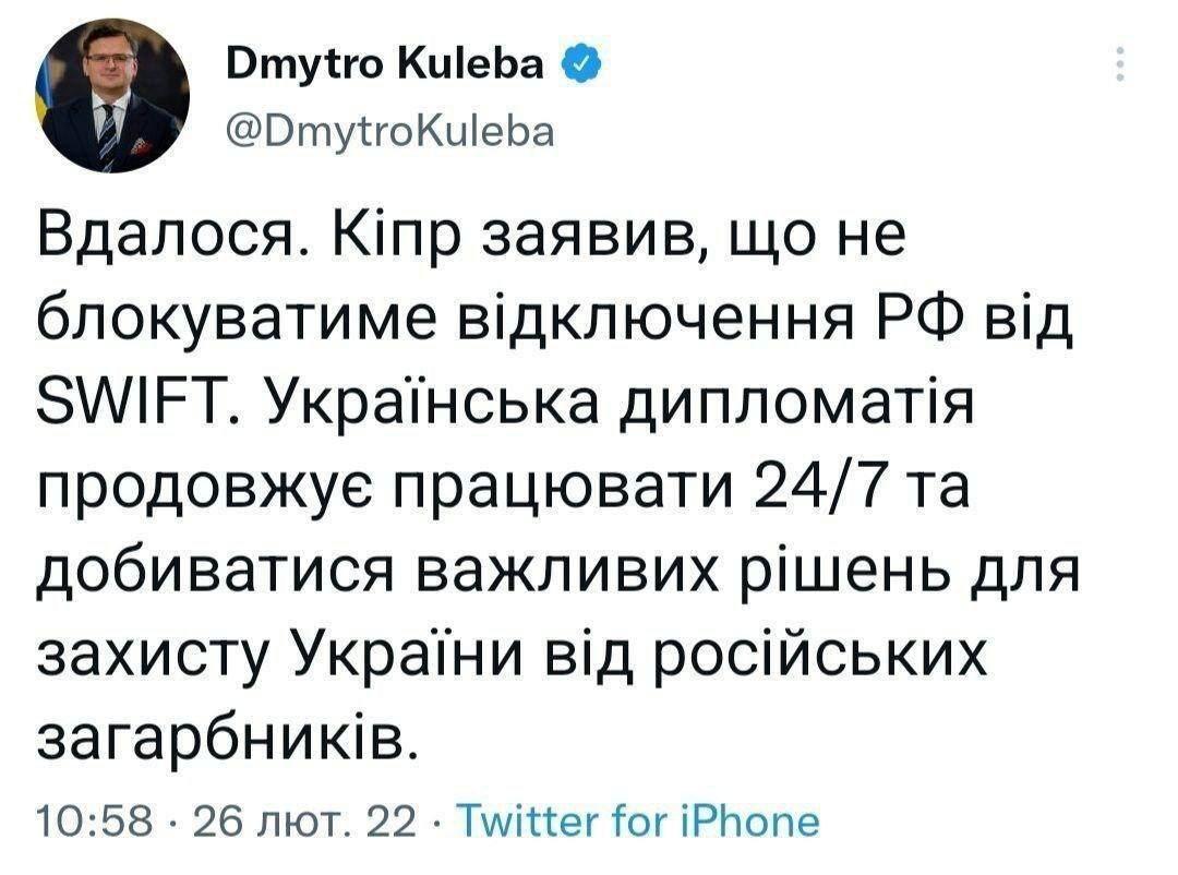 За первых три дня Третьей мировой войны произошло много событий. Они так спрессовались между собой, что часто мозг не успевал осознать ни их масштаб, ни механику принятия. Отголоском внутри тебя оставался возможный эффект. Отключат ли РФ от SWIFT? Этим магическим вопросом задавались все и лишь немногие понимали, о чем идет речь. Система обмена банковскими сообщениями переставала интересовать после того, как на ее место - главной санкционной дубины – начали посягать не такие серьезные в своей непонятности, но яркие действия.
