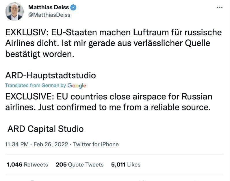 ⚡️ Журналист Матиас Дайсс из Германия заявил, что все страны ЕС готовы закрыть небо для российских авиакомпаний.