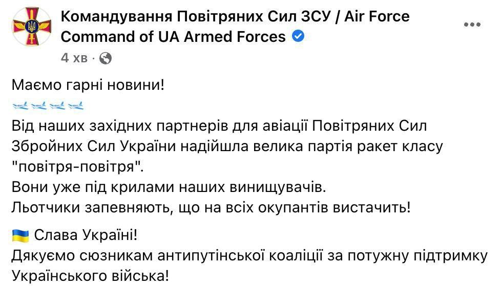 Докладніше: Протиповітряна оборона Повітряних Сил продовжує завдавати суттєвих втрат авіації окупантів, бронетехніці та живій силі противника.