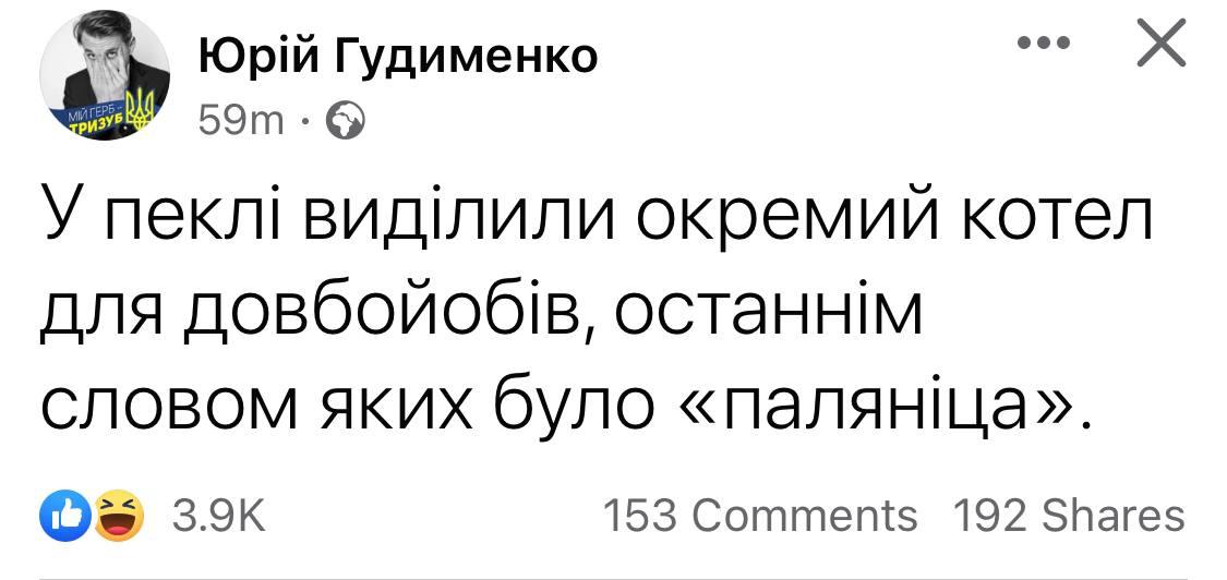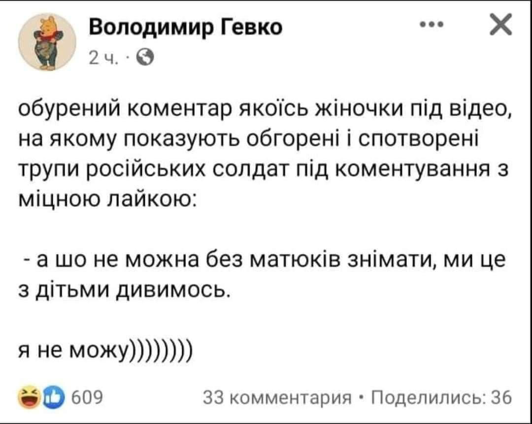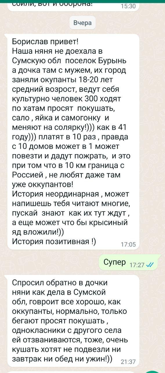 А теперь о главном. Мы сильны, пока мы вместе! Мы можем критиковать власть в мирное время, а в момент войны мы обединяемся вокруг неё. И сегодня я говорю, что Владимир Зеленский президент, который с нами защищает Украину! И мы все защищаем друг друга. Когда война закончится, то будем друг с другом разбираться. А сегодня мы все украинцы и защищаем нашу Украину от врагов! Каждый на своём месте! Каждый, по мере возможности. Но вместе! Так и победим!