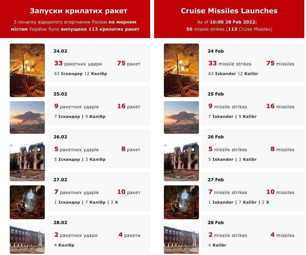 Since the beginning of an uncovered invasion, Russia launched 113 cursed missiles of Iskander and Kalibr types on peaceful cities, towns and villages of Ukraine.