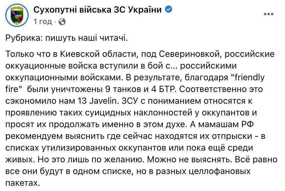 Ти розумієш, що твій вклад у війну навіть близько не співставний з тим, що роблять ЗСУ, авіація та ППО, арта та спн, реактивщики та розвідка.