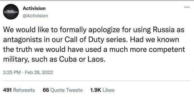 Тот случай, когда на тебя посмотрели в боях с украинской армией, оценили твой уровень и начали с тебя стебаться. С аккаунта похожего на компанию Activision извинились за то, что использовала Россию в своих играх в качестве антагониста и серьёзного противника.