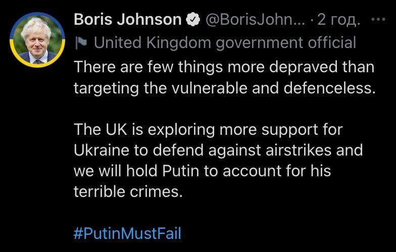 Велика Британія вивчає можливість більшої підтримки України для захисту від авіаударів, і ми притягнемо путіна до відповідальності за його жахливі злочини
