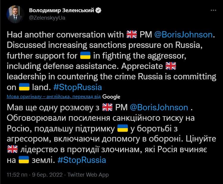 🤝Зеленський провів розмову з британським прем'єром Джонсоном, під час якої сторони зокрема обговорили посилення санкцій проти росії та підтримку Україні.