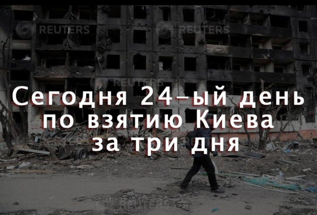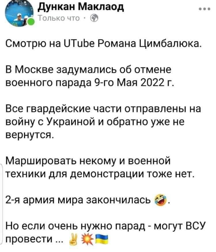 Есть такое смутное ощущение, что если чётко идущая по плану, со строгим соблюдением всех сроков операция продлится ещё пару недель, то вместо парада на 9 мая будут показывать прошлогодний парад в записи, потому что маршировать уже будет некому.