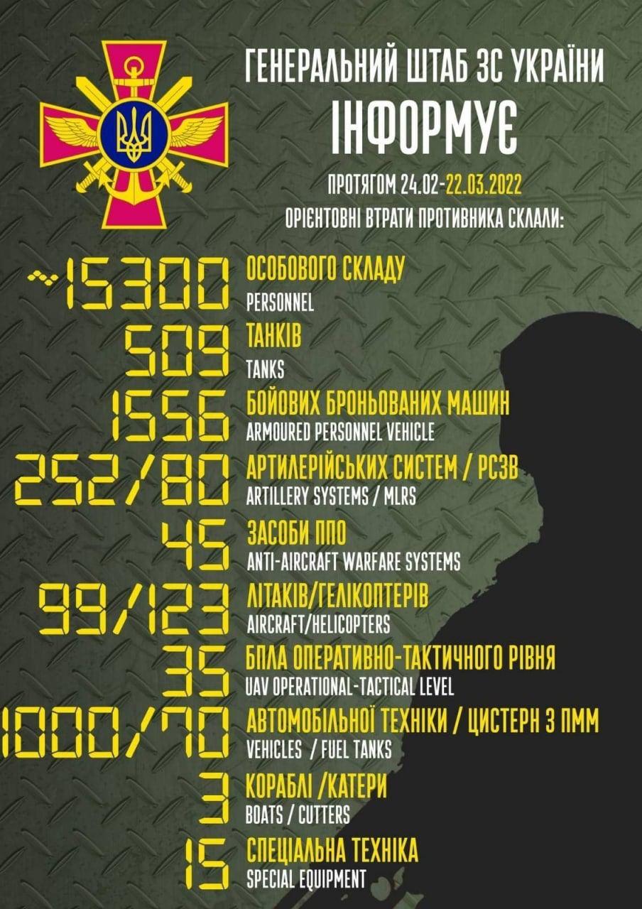 ⚡️У зв’язку із відсутністю успіхів у війні з Українським народом ворог перейшов до тотального знищення об’єктів критичної інфраструктури. Оперативна інформація Генерального штабу ЗСУ станом на 24.00 22.03.2022 щодо російського вторгнення