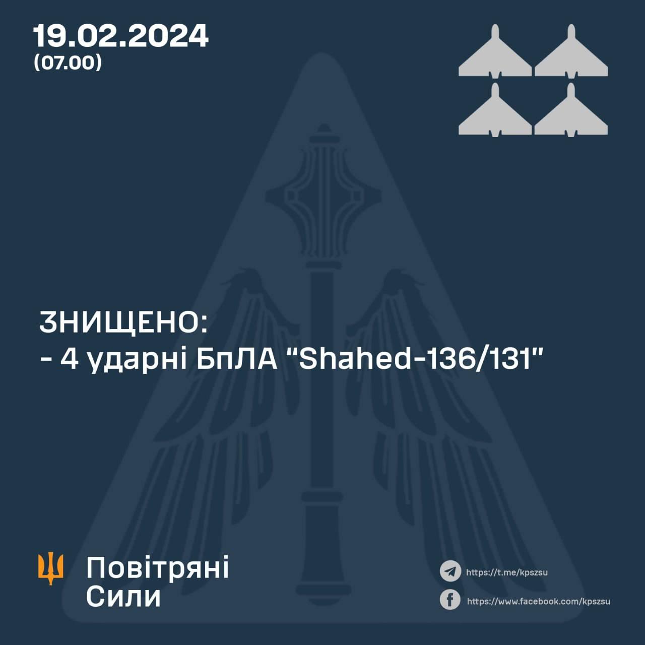 ❌Сьогодні вночі Сили оборони України знищили усі чотири ударні БпЛА типу Shahed, які противник випустив у напрямку Харківщини із Бєлгородської області.