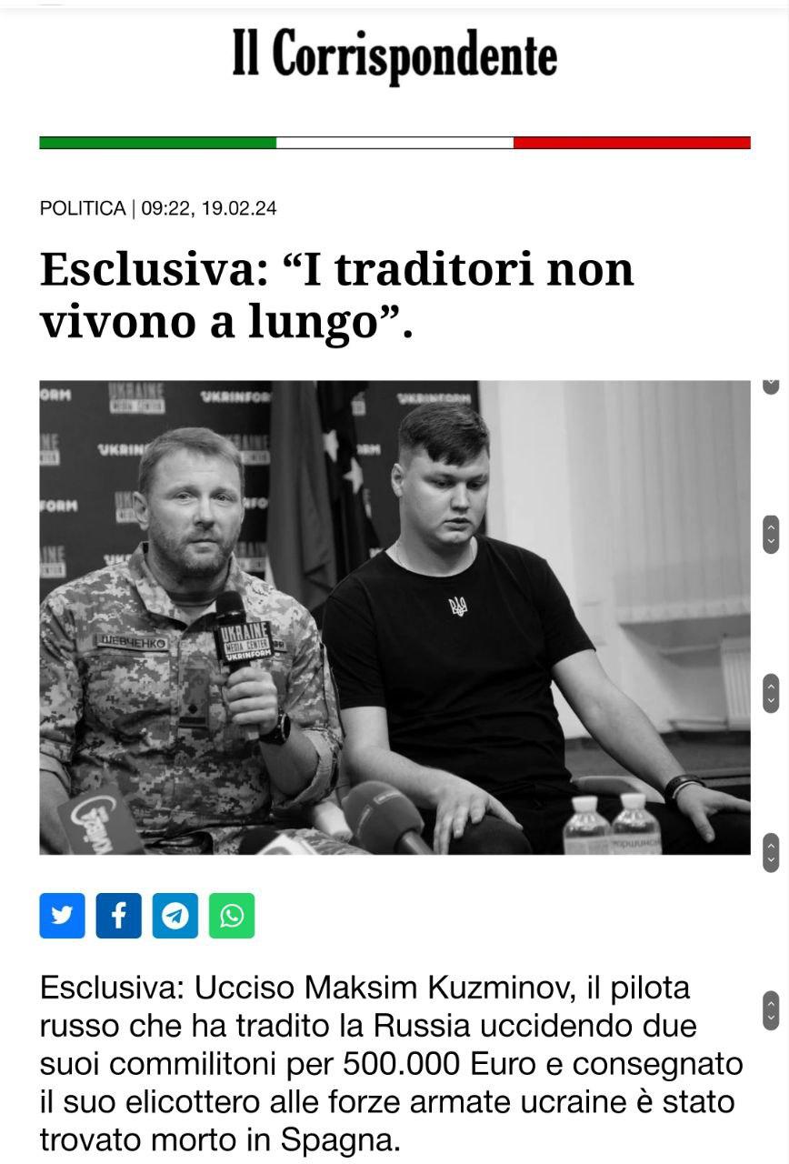 Італійське ЗМІ пише, що в Іспанії, знайдений мертвим Максим Кузьмінов, який викрав російський військовий гелікоптер. Інформацію про це розповсюдило видання Il Correspondente.