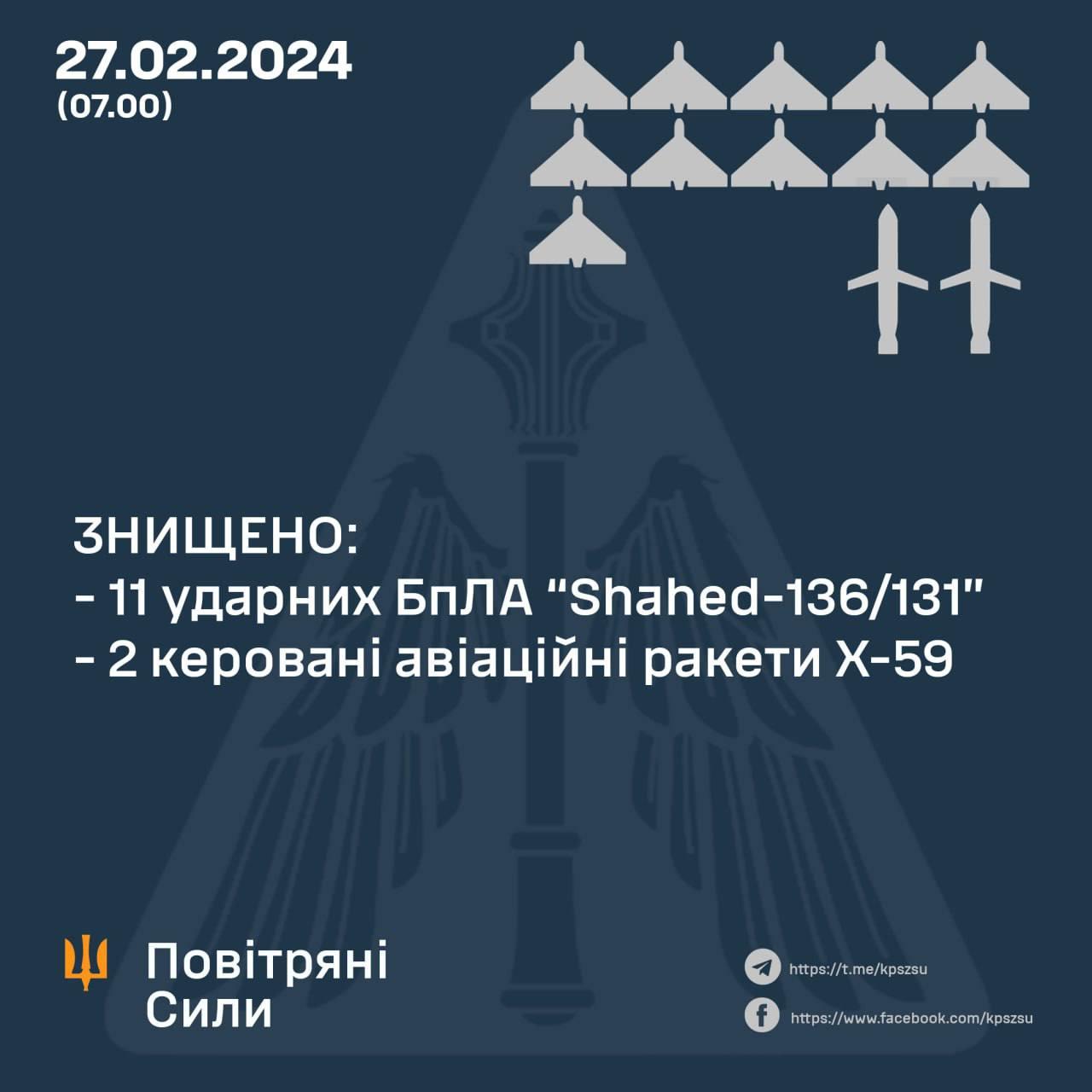 В результаті бойової роботи протиповітряною обороною знищено дві керовані авіаційні ракети Х-59 та 11 «шахедів» у межах Харківської, Сумської, Дніпропетровської, Хмельницької та Кіровоградської областей.