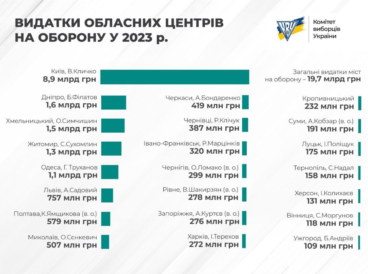 Комітет виборців України проаналізував дані щодо бюджетних видатків обласних центрів та міста Києва на сили оборони у 2023 році. Результати аналізу представлено у вигляді рейтингу. Першу сходинку рейтингу посів Київ (міський голова - Віталій Кличко), який минулого року спрямував на підтримку сил оборони близько 9 млрд. Це майже стільки ж, скільки усі інші обласні центри разом