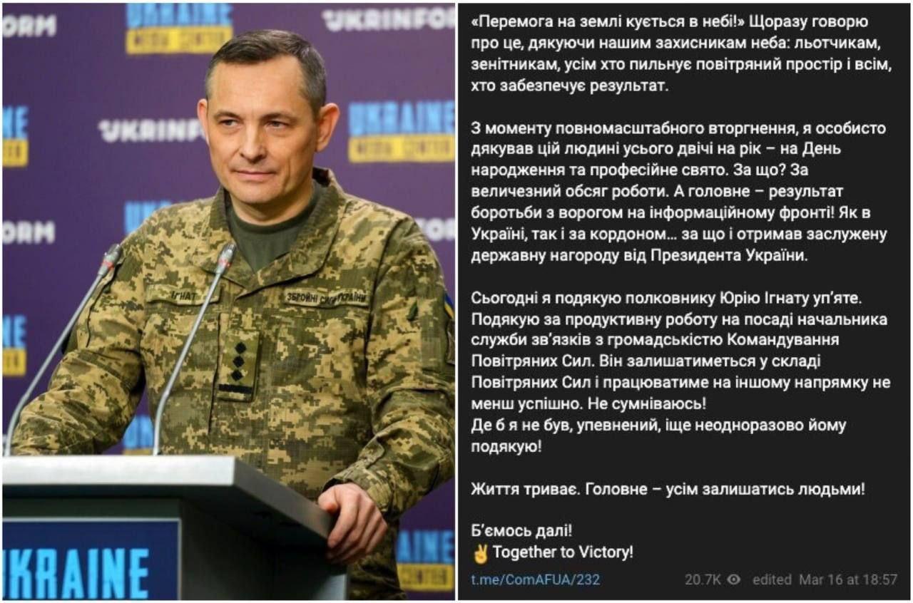 ❗️ Речника Повітряних сил СЗУ Ігната звільнили з посади.